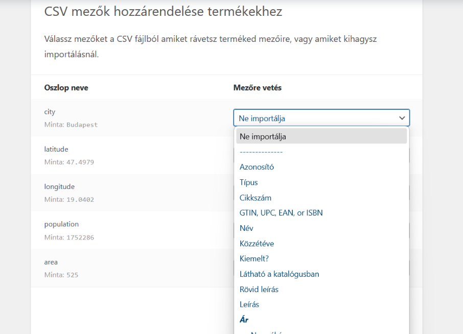 - az importálásra kattintva, először fel kell tölteni a csv állományt (excelben lehet menteni csv-be a táblázatot, a csv-ben az adatok vesszővel vannak elválasztva)
