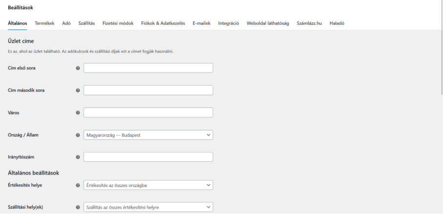 - Itt az üzlettel kapcsolatban lehet beállítni emailt, láthatóságot stb. a megfelelő menü alatt, ? a mezők mellett segít hogy mit állít be az adott mező