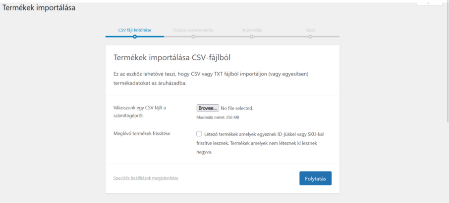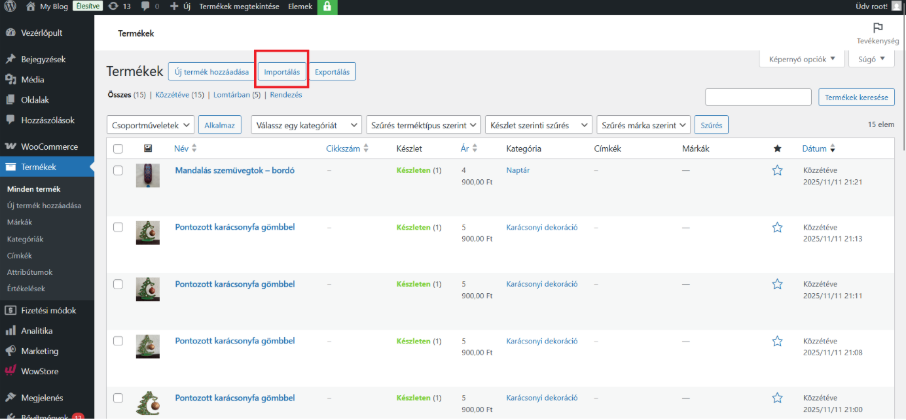 - menjünk a termékek fülön belül a minden termékre és ott felül lesz az importálás