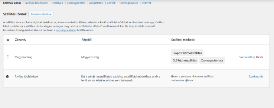 - zónát kell létrehozni és ezekhez lehet hozzáadni szállítási módokat amelyeknek különböző áraik lehetnek