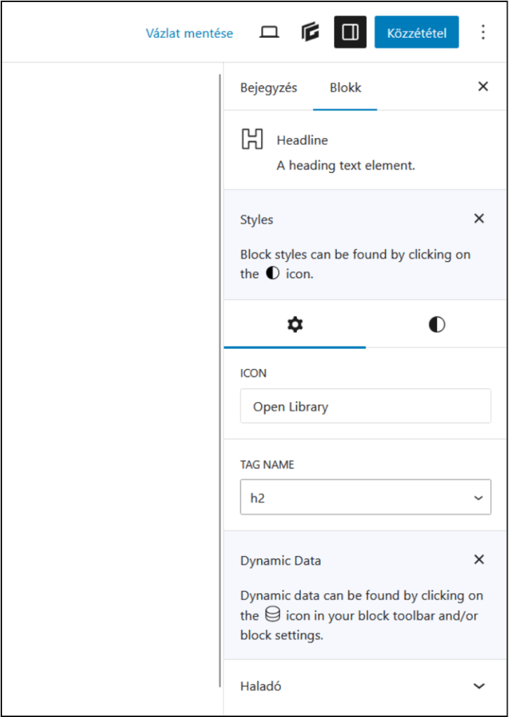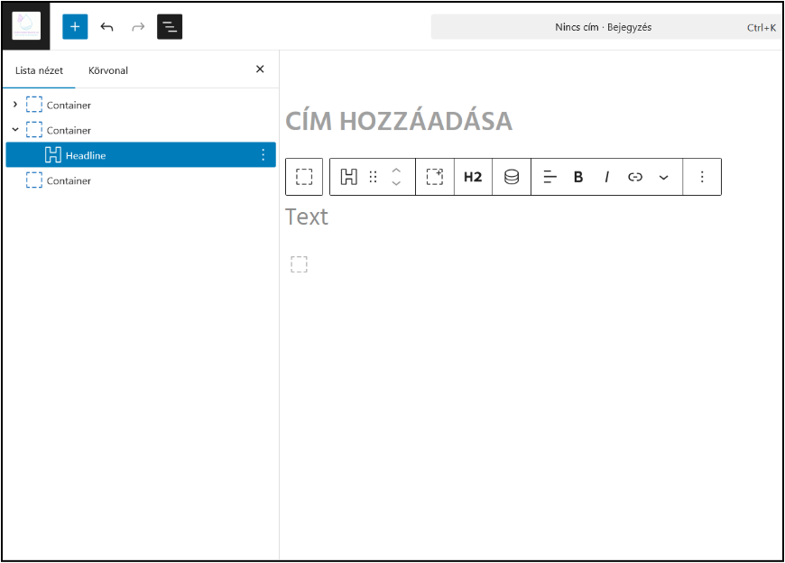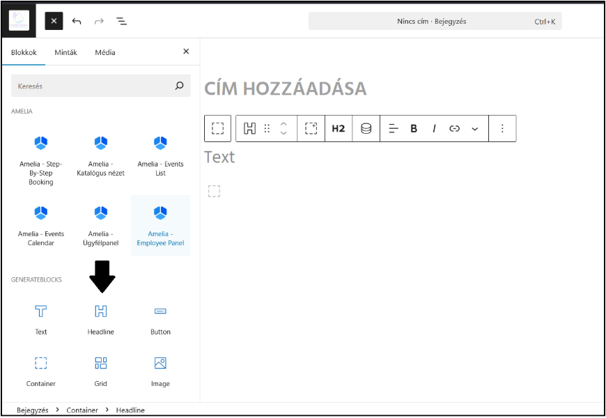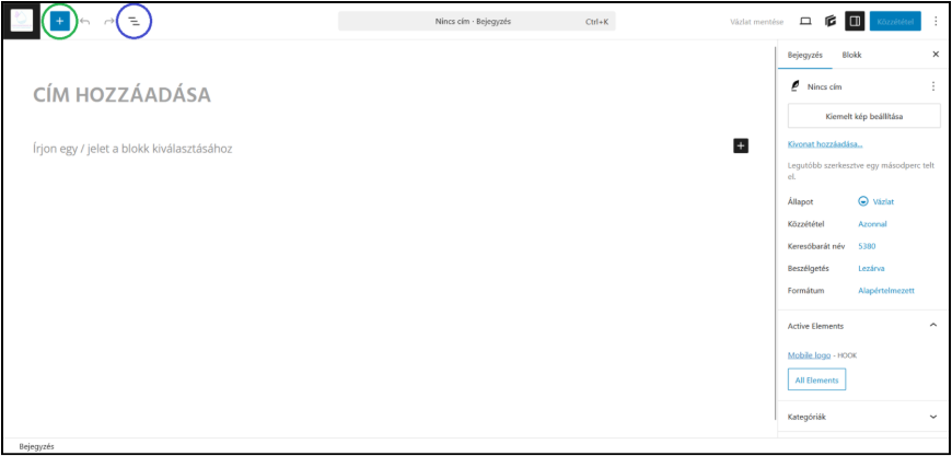 Ezután megnyílik a Bejegyzésszerkesztő. A plusz jelre (+) kattintva láthatod a hozzáadható elemeket (pl. szöveg, gomb stb.). Az elemeket kattintással vagy húzd és ejtsd (drag & drop) módszerrel tudod a bejegyzéshez adni. Érdemes a GenerateBlocks elemeit használni.