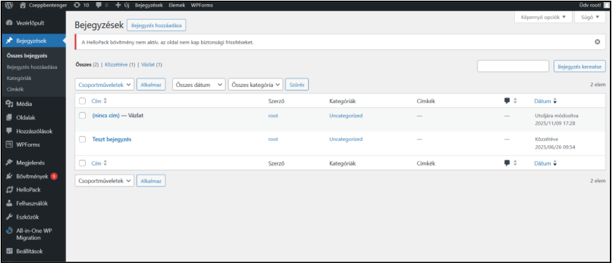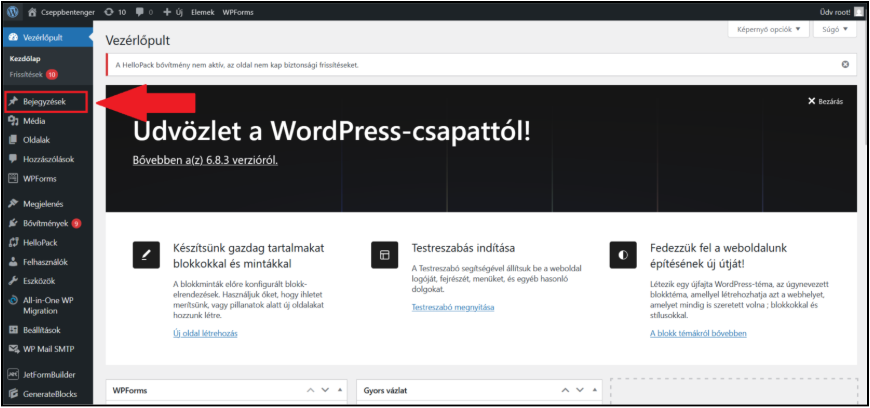 Miután bejelentkezel a WordPress-be, a Vezérlőpulton találod magad. Innen a bal oldali menüben válaszd a Bejegyzések menüpontot.